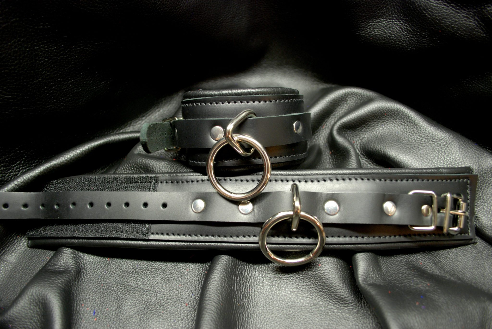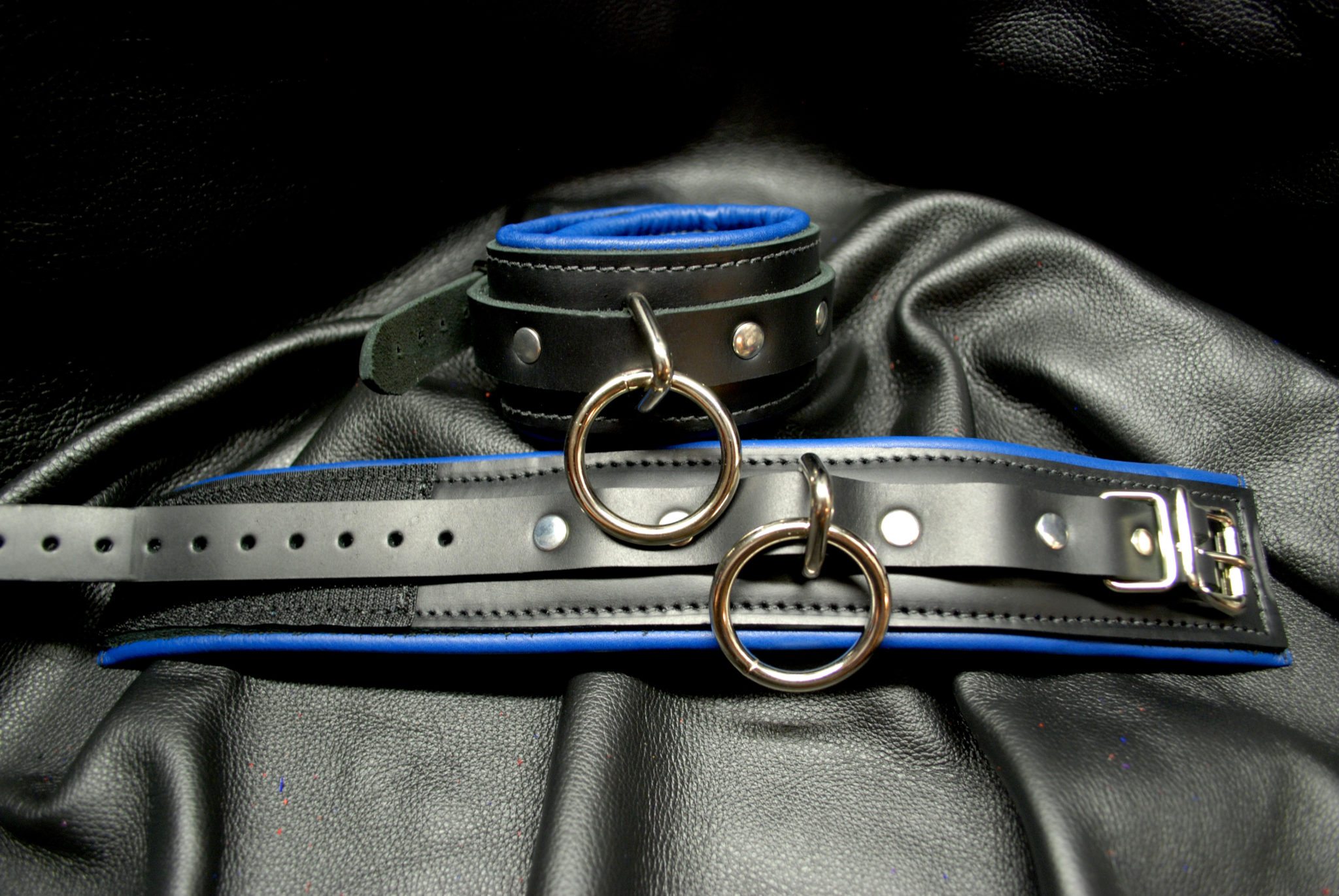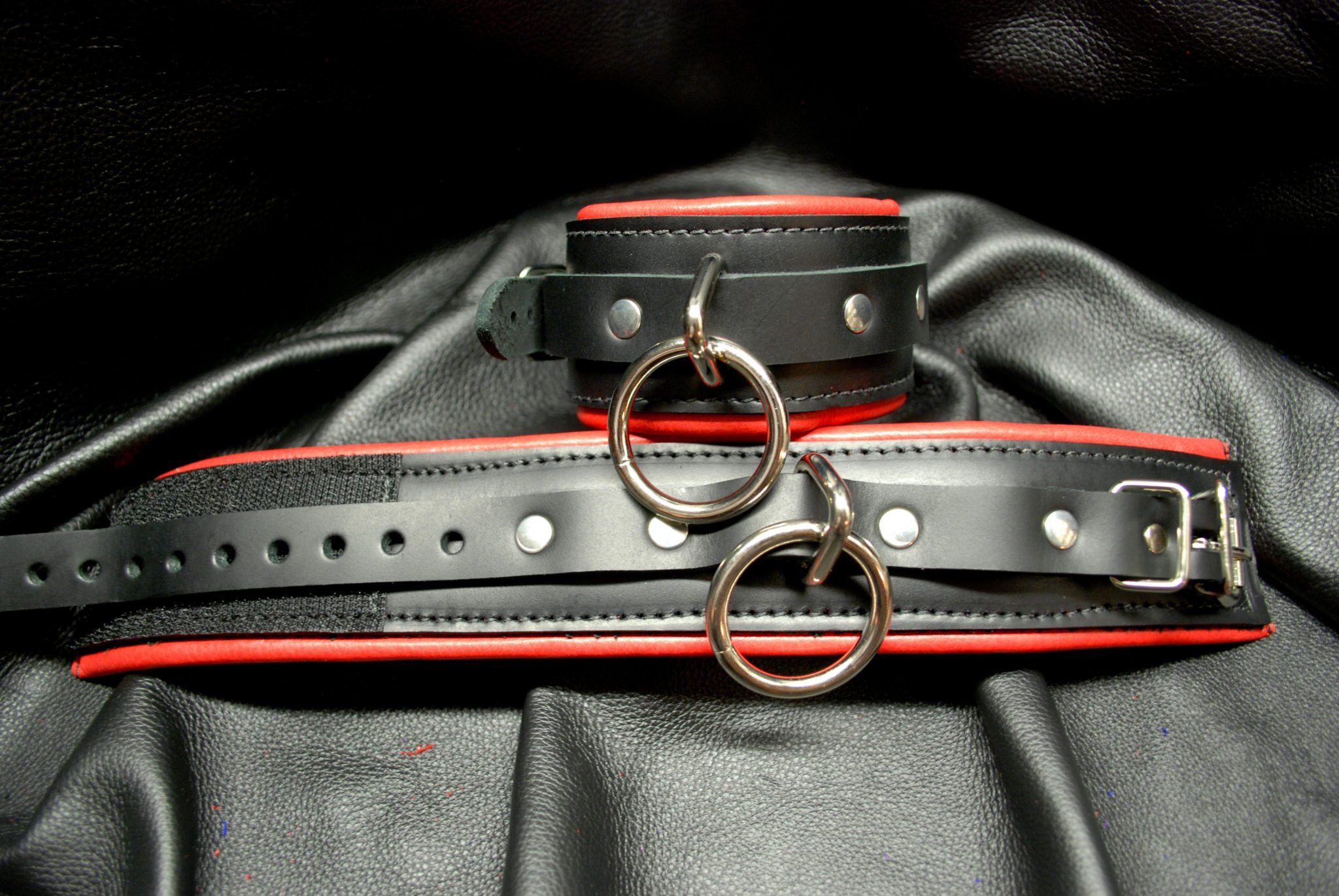 These restraints are custom made per order and offer a one of a kind unique restraint for your toy chest. The cuffs base is 2″ wide leather. The strap is 3/4″ wide with stitching along the sides. A double steel ring adorns the cuffs – along with a standard buckle. Foam padded with accent leather color wrap on padding. Locking buckles are available for these as well as simple D rings instead of a double ring. The cuffs fit wrists AND (most) ankles, up to around 12″. Velcro is used to help secure the cuffs. Custom made per order. This item has a three week shipment time.